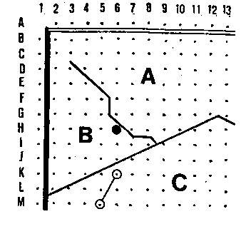 Im Falle, daß der Pan-Zug im Gebiet B liegt, muß sich Weiß also etwas anderes einfallen lassen. Naheliegend sind 1.I8 mit sehr vielen verwickelten Abspielen oder der wesentlich sicherere Zug 1.H9. Spielt Schwarz auf 1.H9 2.G8- (oder H 10), so antwortet Weiß 3.I11- mit 4.F10-, 5.G12- bzw. 5.F14, und Schwarz kann Weiß nicht mehr hindern, den oberen Rand zu errei-chen. Auch die Verbindung von K6 nach H9 kann Schwarz nicht verhindern: auf 6.I9- folgt 7.J9- mit 9.I7- oder 7.L8-.